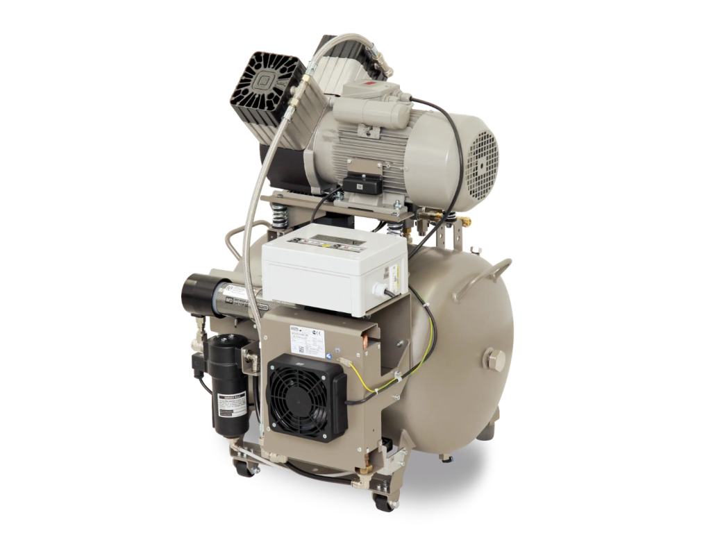 Bezolejový kompresor EKOM řady DK50 2V/50 S/M je zdrojem čistého, tlakového, bezolejového vzduchu určeného pro pohon stomatologických přístrojů a zařízení. Svými parametry a velikostí vzdušníku 50 litrů je vhodný k napájení dvou stomatologických souprav nebo zařízení v dentálních laboratořích. Vzduch produkovaný bezolejovým kompresorem vytváří vyšší stupeň hygieny a kvality práce zubního lékaře a nezatěžuje pracovní prostředí cizorodými látkami.
